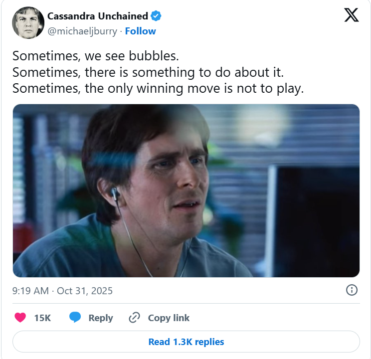 “有时,我们会看到泡沫。有时,我们能做些什么。有时,唯一的获胜策略就是不参与。”伯里在X平台发帖称,还附上了演员克里斯蒂安·贝尔(Christian Bale)在《大空头》中的剧照——贝尔在片中饰演伯里。