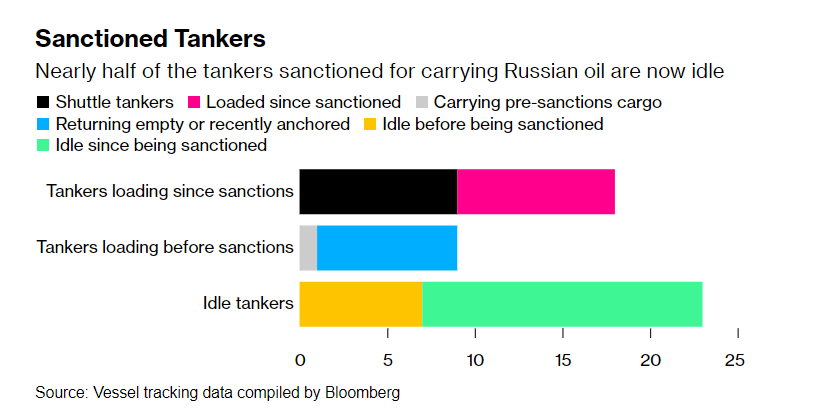 在美国制裁的重压下,俄罗斯用于运输原油的庞大油轮船队中的一部分正在陷入停顿,这表明西方监管机构采取的更严厉措施可能开始对莫斯科产生切实影响。