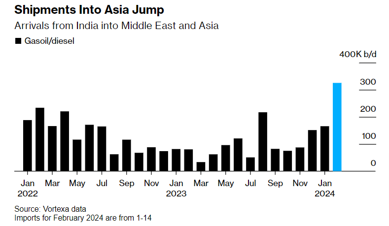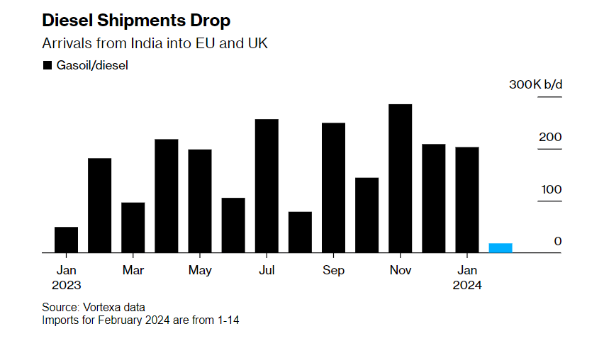彭博社汇编的Vortexa Ltd.数据显示,2月前两周,从印度运往欧洲的燃料平均每天仅为1.8万桶,比1月份的平均水平下降了90%以上。斯巴达商品公司(Sparta Commodities)分析师詹姆斯·诺埃尔-贝西克(James Noel-Beswick)表示,流量下降的部分原因是上个月向西方运输的成本上涨。