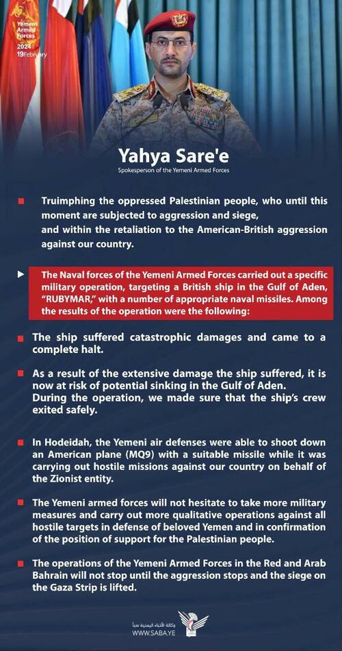 胡塞发言人叶海亚·萨雷亚在一份声明中警告说,“Rubymar”号现在有沉没的危险。“这艘船遭受了灾难性的破坏,完全停了下来。在行动中,我们有确保船员安全。”