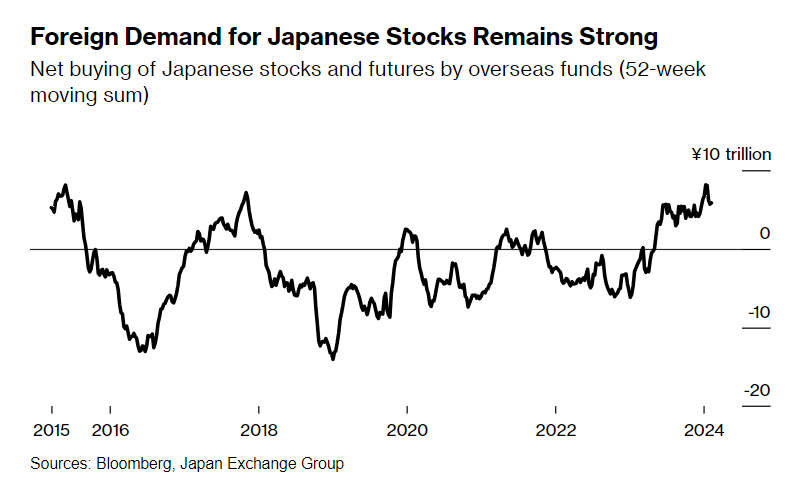 1月中旬,全球投资者对日本股票和股指期货净买入总额的52周移动平均值攀升至8.1万亿日元(540亿美元),是自2015年交易所有数据以来最高水平。尽管在截至2月9日的一周内,购买额已放缓至5.8万亿日元,但仍远高于2015年以来2.4万亿日元的平均水平。