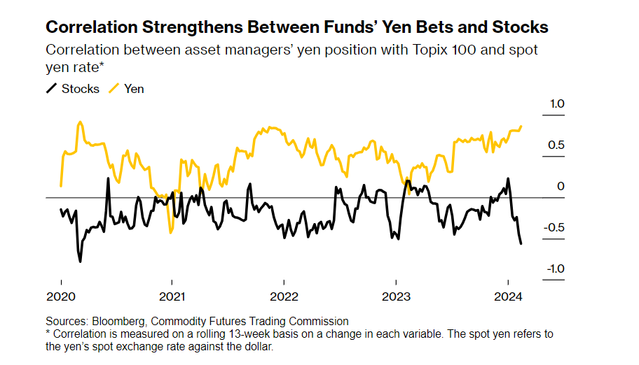 根据彭博社对美国商品期货交易委员会(CFTC)数据的分析,截至2月13日,资产管理公司的日元头寸与东证100指数之间的相关系数为-0.56,为2020年以来的最高水平。这表明,当日本大市值股票上涨时,资产管理公司的日元头寸往往会转向看跌。