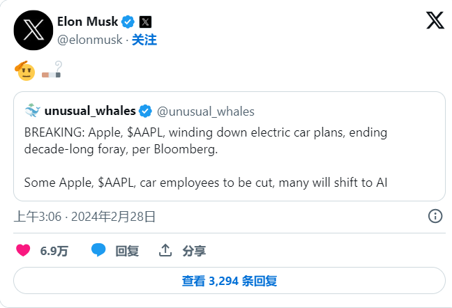 他表示:“虽然对于苹果来说,汽车行业比生成式AI拥有更大的长期收入机会,但终止造车计划的决定确实有好处,因为这将增加公司在生成式AI领域做一些深刻的事情的紧迫性。这对特斯拉来说是积极的。我一直相信苹果是特斯拉在美国最大的长期竞争对手。”