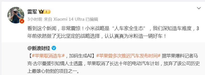 同样正试图从造手机跨界到造车的小米创办人、董事长兼CEO雷军则表示“非常震惊”,同时也不忘为自家的小米汽车卖一波广告。他在微博发文表示:看到这个新闻,非常震惊!小米战略是“人车家全生态”,我们深知造车难度,3年前依然做了无比坚定的战略选择,认认真真为米粉造一辆好车!