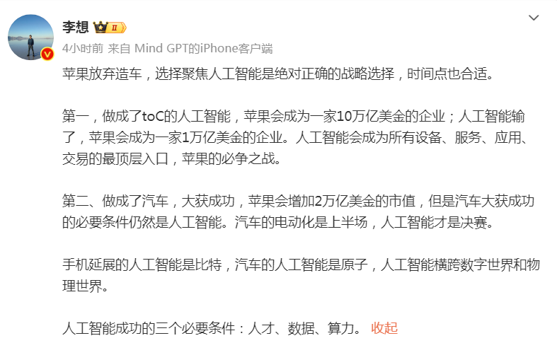 理想汽车CEO李想对苹果的最新举动表示赞赏。他指出, 苹果放弃造车而聚焦人工智能是绝对正确的战略选择,时间点也合适。他认为,人工智能会成为所有设备、服务、应用、交易的最顶层入口,苹果的必争之战。