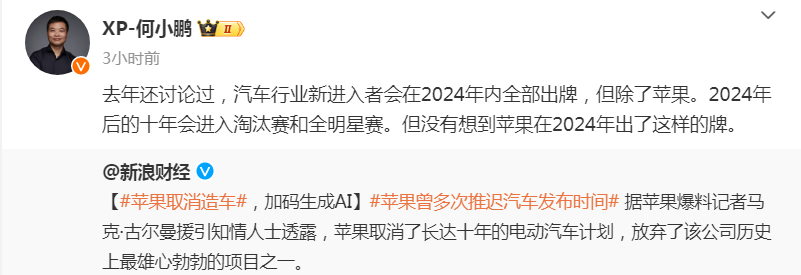 小鹏汽车董事长何小鹏也表达了自己的意外。他表示,去年还讨论过,汽车行业新进入者会在2024年内全部出牌,但除了苹果。2024年后的十年会进入淘汰赛和全明星赛。但没有想到苹果在2024年出了这样的牌。