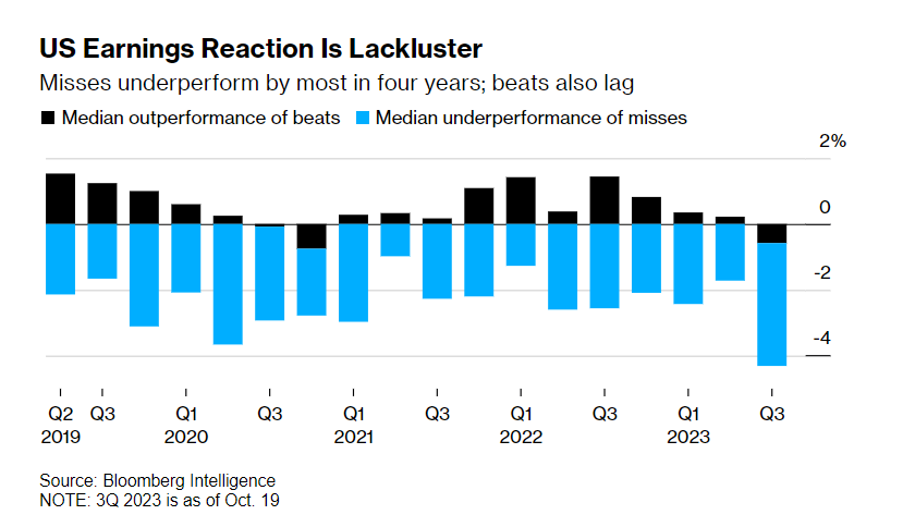 市场对财报季的初期反应也乏善可陈。外媒汇编的数据显示,投资者对利润低于预期的美国公司的抛售力度达到四年来最严重的程度。