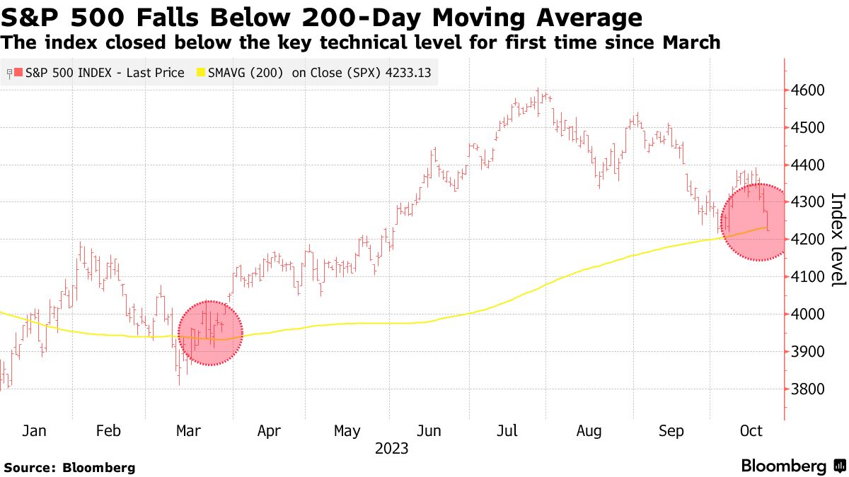 威尔逊的悲观观点在一定程度上得到了证实,由于担心利率长期上升,标普500指数连续第三个月下跌,上周五收于4224点,自3月份以来首次低于200日移动平均线。此处被认为是关键的技术支撑位,交易者用它来评估长期趋势是上涨还是下跌。