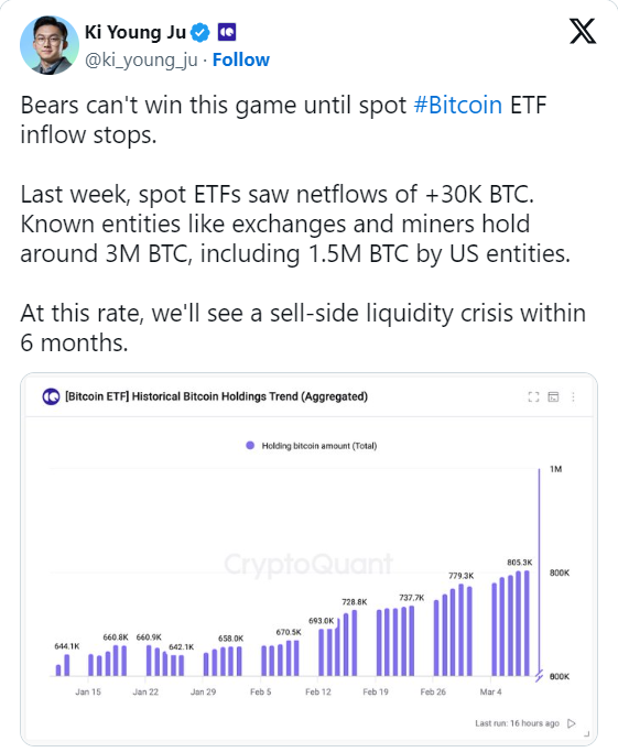 他指出,“上周仅现货比特币ETF的净流量就超过3万枚比特币。而交易所和矿工等已知实体持有约300万枚 ,其中美国实体持有150万枚。按照这个速度,我们将在6个月内看到卖方流动性危机。”