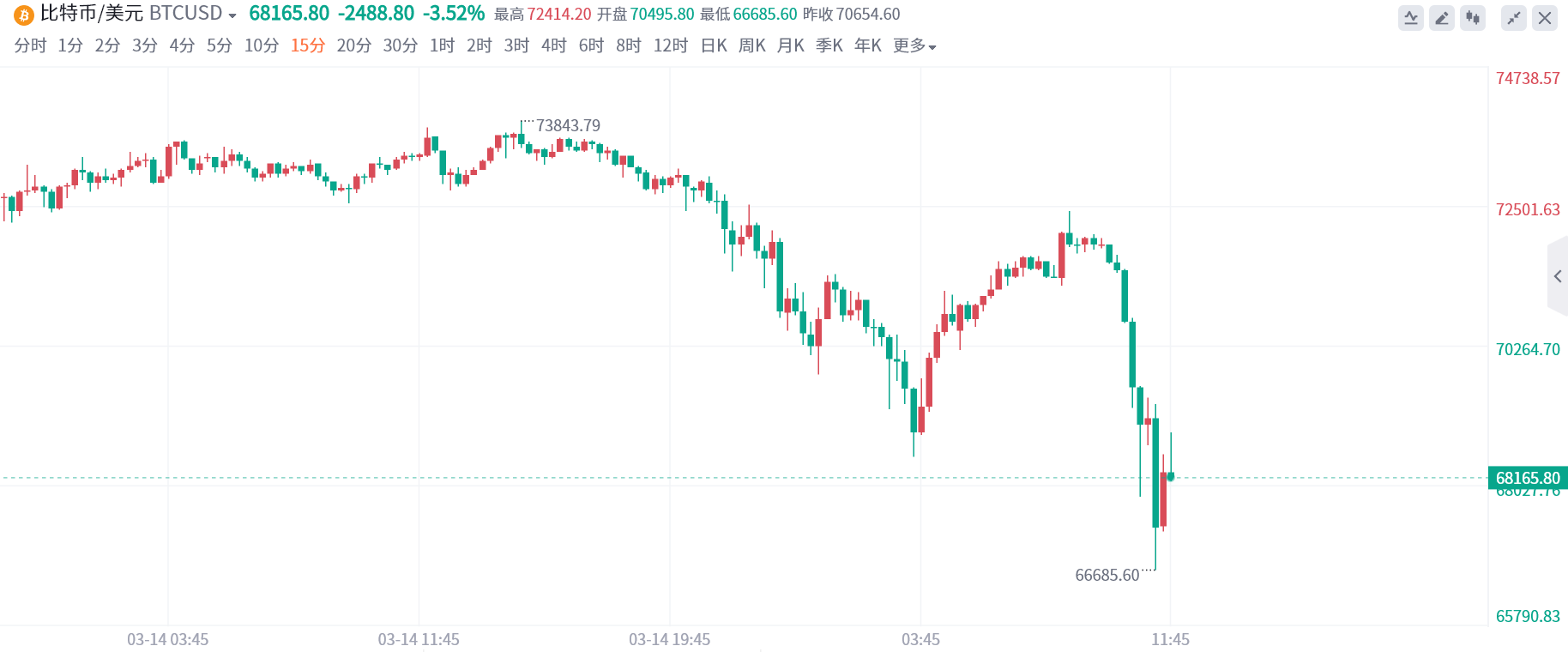 截至周五上午11:27,比特币日内大跌5.00%,盘中下破6.7万美元,此前一天曾创下近73798美元的历史峰值。今年迄今为止,比特币和前100种代币(包括Ether、BNB和Solana等)的指标均上涨了约60%。
