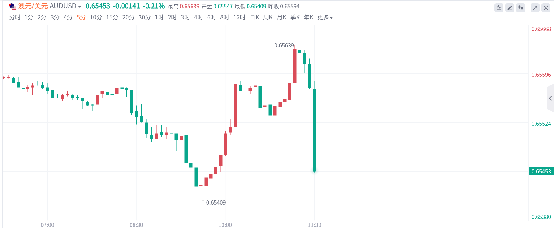 澳洲联储公布利率决议后,澳元兑美元短线下挫超10点。
