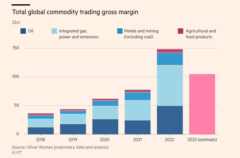 相比之下,大宗商品行业在疫情前(2018年)的毛利润大约为360亿美元,但在疫情和俄乌冲突连番冲击之后的2022年,行业利润达到创纪录的1480美元。