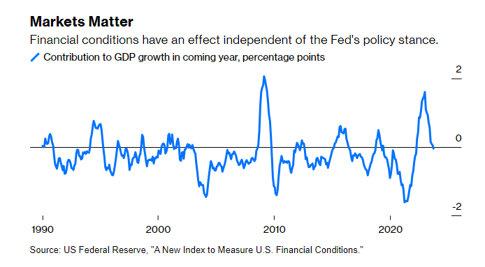 如果金融状况总是与美联储的短期利率目标步调一致,那么它们本身就不值得太多关注。目前看来,这并没有实现。股票市场的涨跌不受短期利率的影响,美元的价值可以根据海外经济活动及其对其他国家货币政策的影响而变化,银行体系的困境也可以独立地收紧金融状况,今年春天美国一些地区性银行陷入困境时就发生了这种情况。