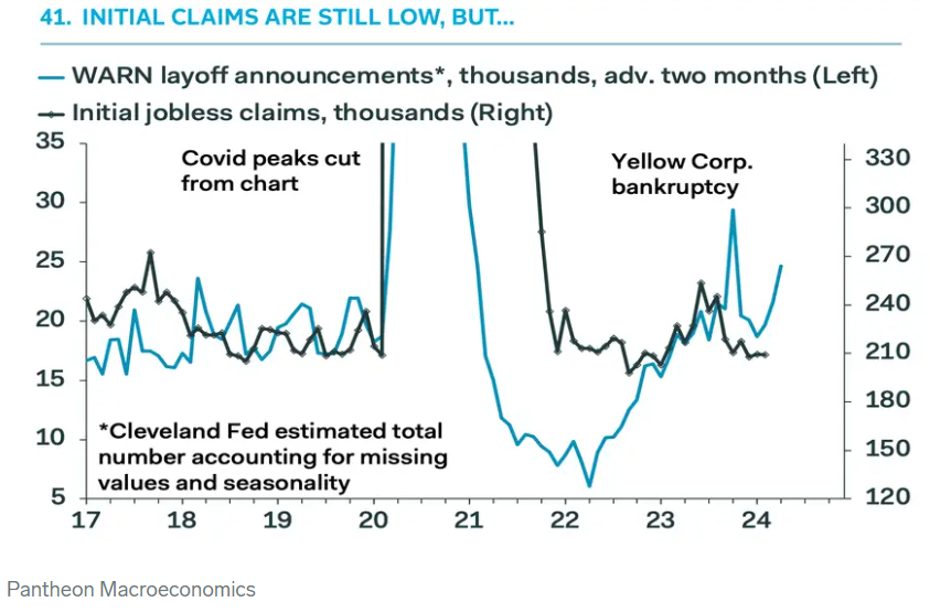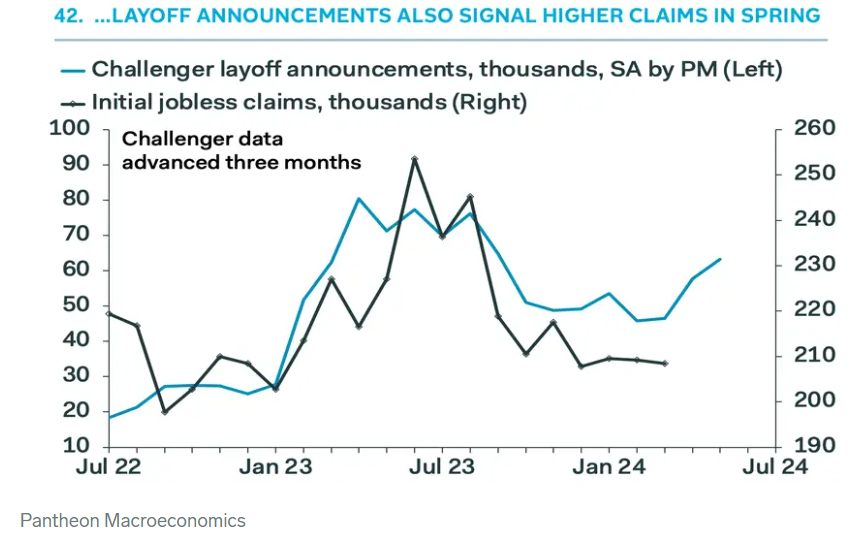 来自Challenger, Gray & Christmas就业服务公司的Challenger报告展示了类似的裁员数据,该报告显示过去几个月裁员人数一直在上升,而其数据通常领先于初请数据。