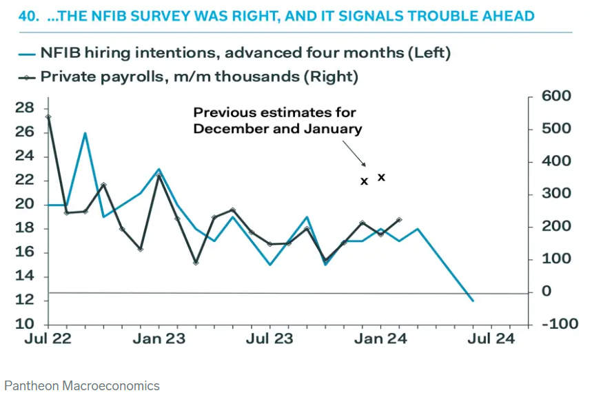 曾在2008年经济衰退前发出警告的首席经济学家Ian Shepherdson,分享了五张图表,表明今年春季美国劳动力市场将显著走弱,这将促使美联储在2024年降息5次。
