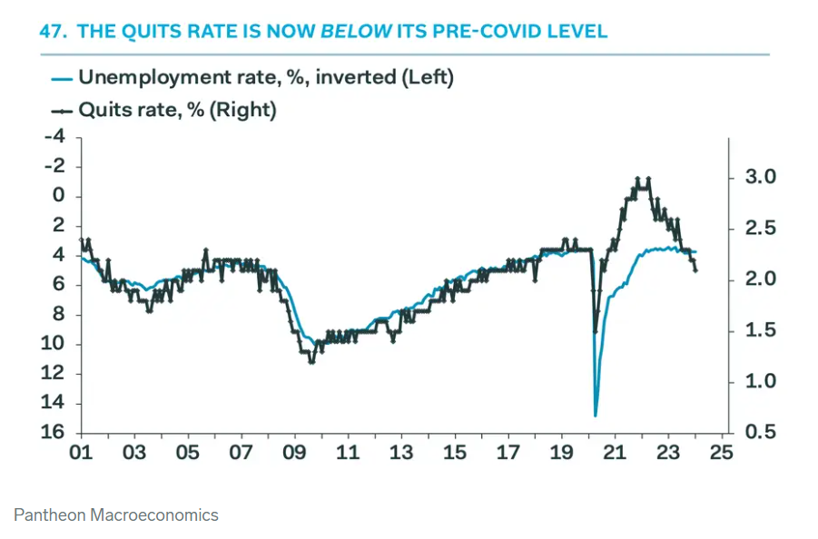 另一个观察劳动力市场状况的方法是查看留在当前工作岗位的员工比例。辞职率目前略高于2%,低于疫情前水平,并从两年前的3%下降,这意味着工作机会正在变得稀少。