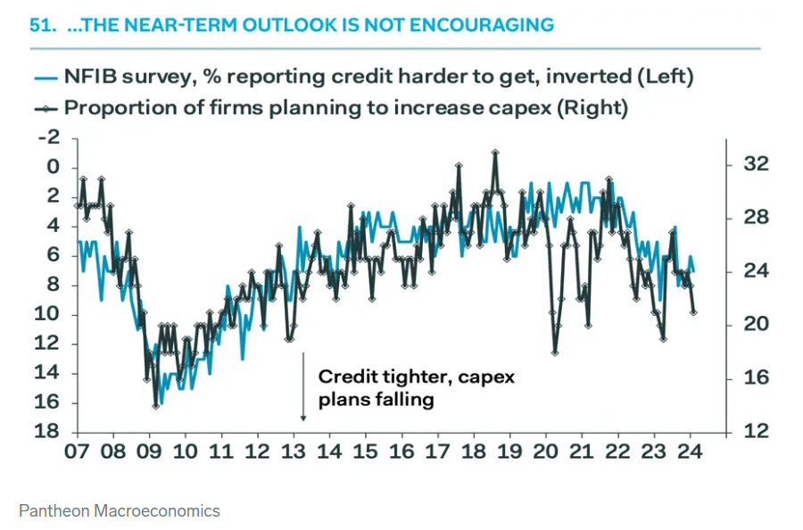 与小型企业悲观招聘前景相关的是NFIB的一项调查数据,该数据显示越来越多的小企业表示如今难以获得贷款。这不仅影响了企业通过投资新项目来扩大业务的计划,也可能影响它们支付薪资的能力,从而在招聘上更为谨慎。
