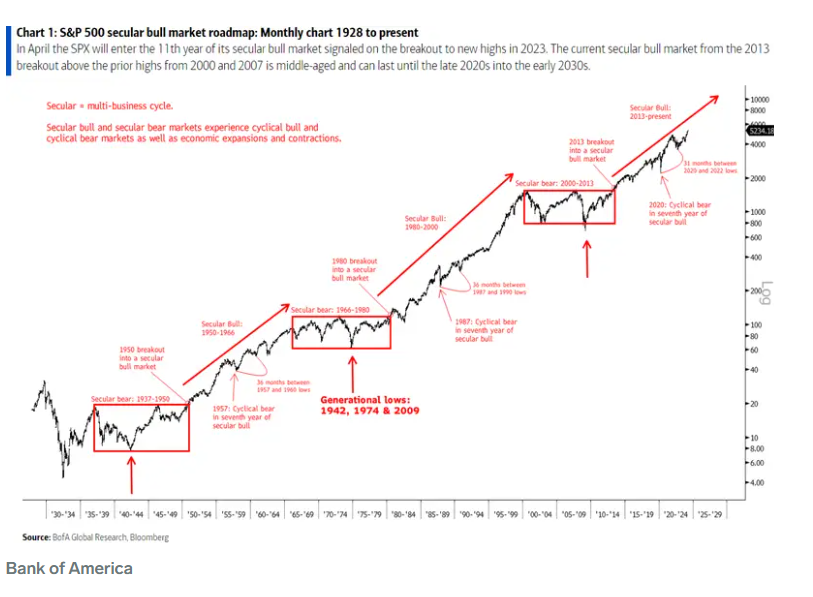 美国银行认为,虽然美股的长期牛市已进入第11个年头,但仍有充足的动力进一步上涨。这场长期牛市在2013年4月正式开启,当时股市超越了2007年和2000年的前期高点。2022年12月,标普500指数突破4600点,再次确认了这一长期上升趋势。