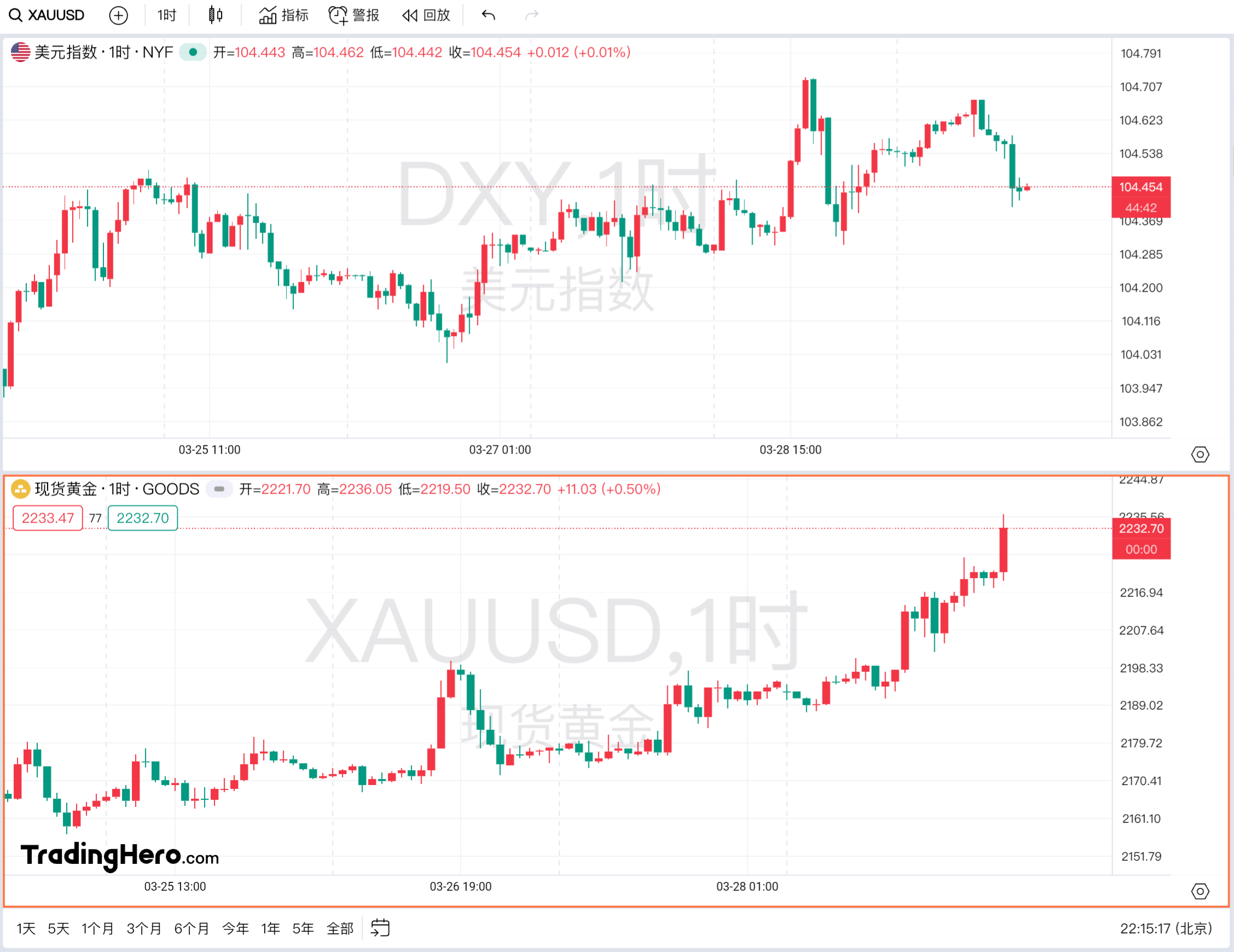 本周美元指数走势震荡,整体变动不大。现货黄金则一路走高,最高上触2236美元/盎司,再创历史新高,延续了由美联储降息预期和地缘政治紧张局势推动的涨势,3月份累计涨超9%,为2020年7月以来最佳月度表现。