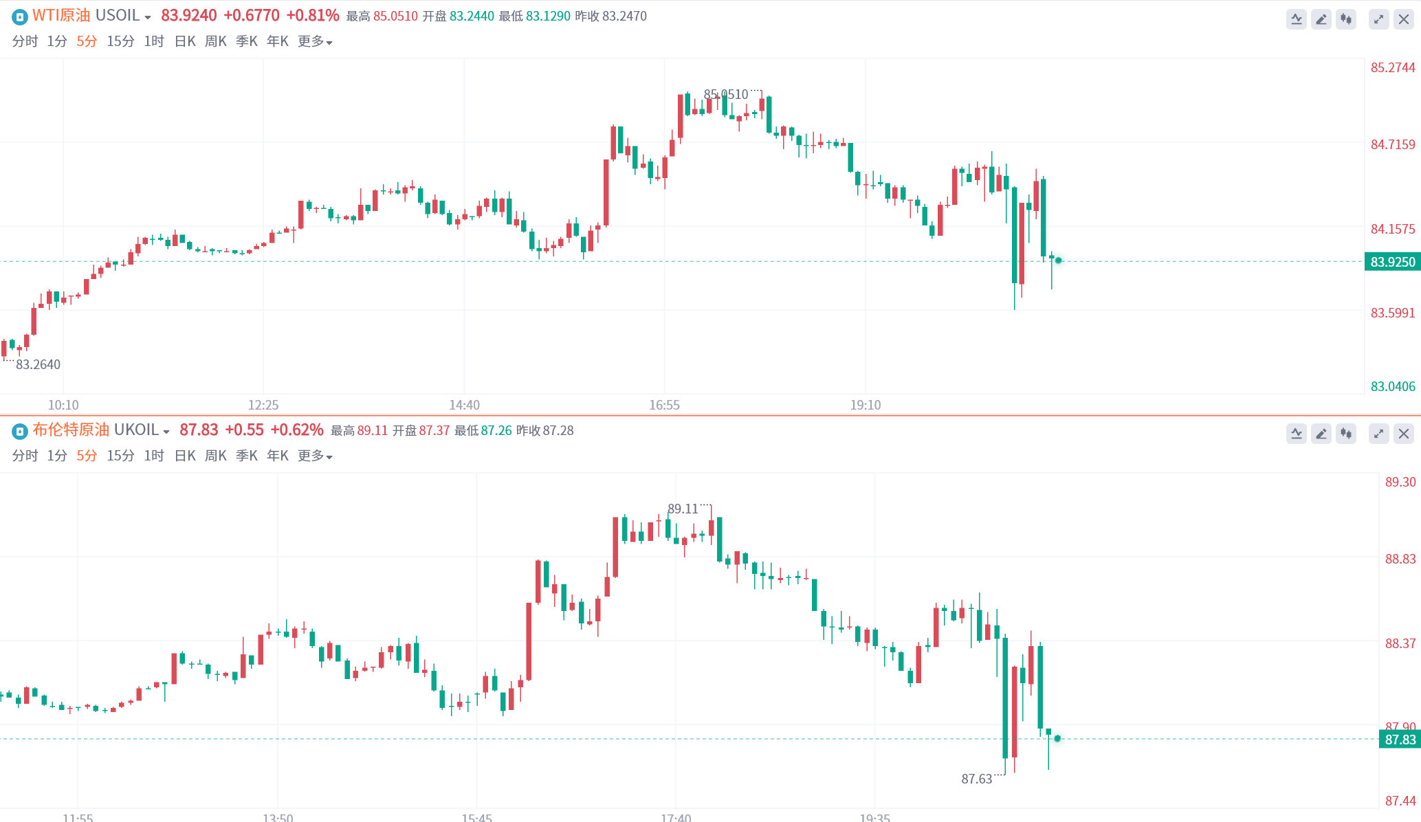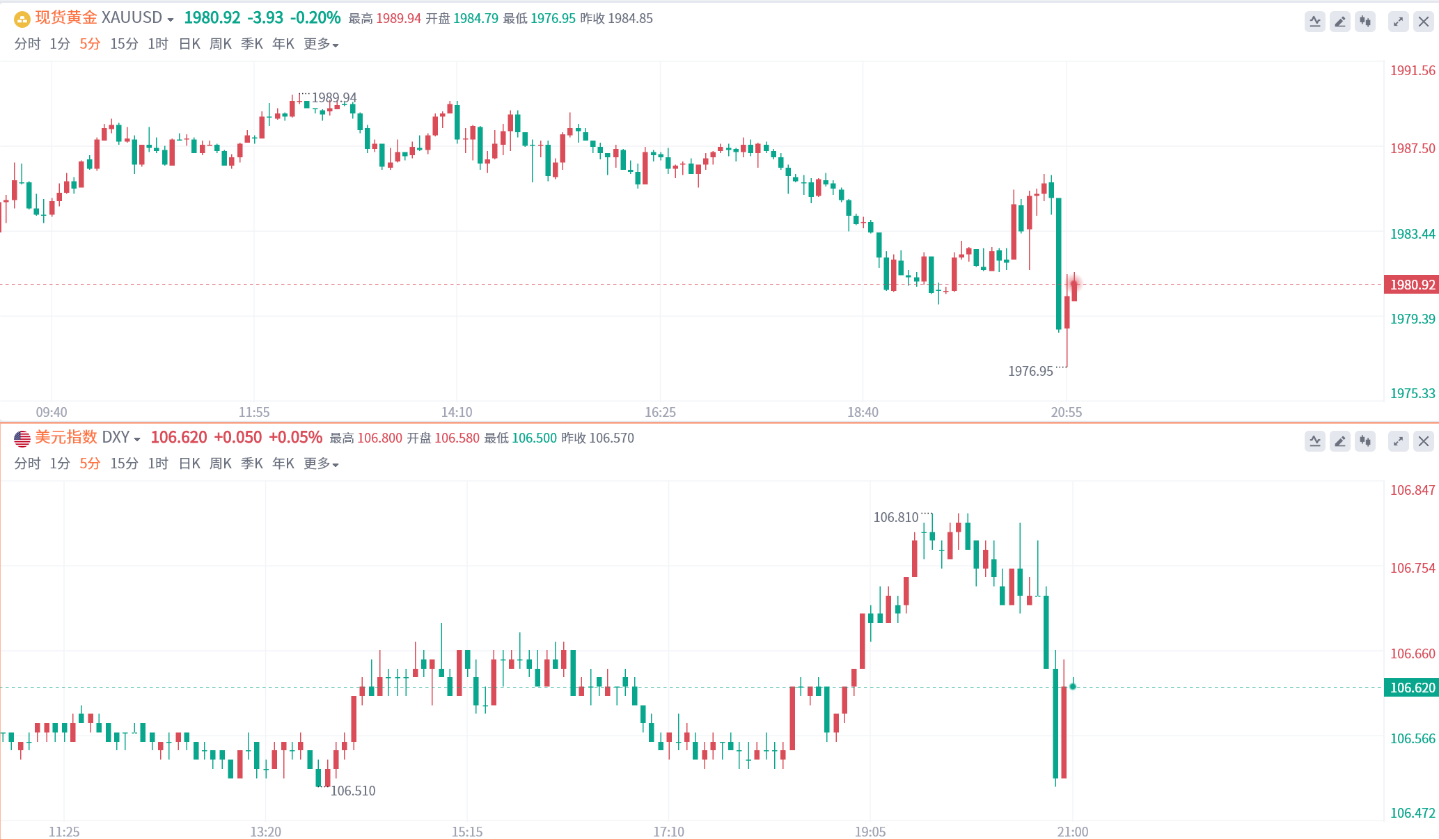 消息公布后,美元指数DXY短线下挫超20点,报106.59。美、布两油短线下挫1美元,分别报83.97美元/桶和87.85美元/桶。现货黄金短线跌幅扩大至10美元,报1978.16美元/盎司。