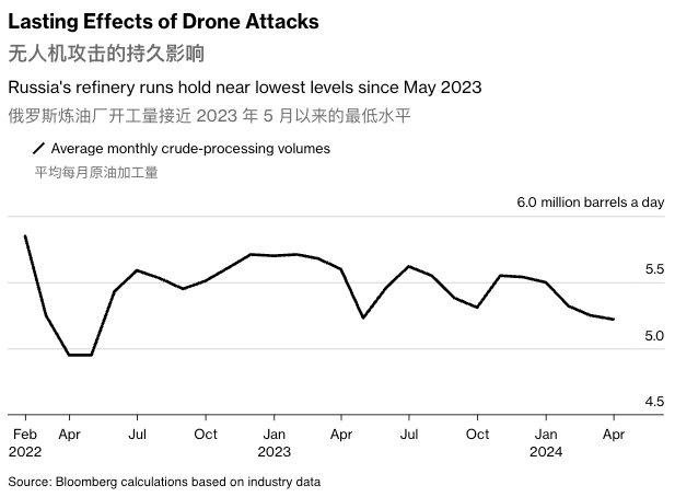 今年早些时候,乌克兰无人机袭击了俄罗斯主要炼油厂,导致其部分或完全关闭。国际能源署 (IEA)曾表示,乌克兰对俄罗斯炼油厂的无人机袭击可能会扰乱全球燃料市场,预计第二季度俄罗斯炼油厂产能可能会减少多达60万桶/日。
