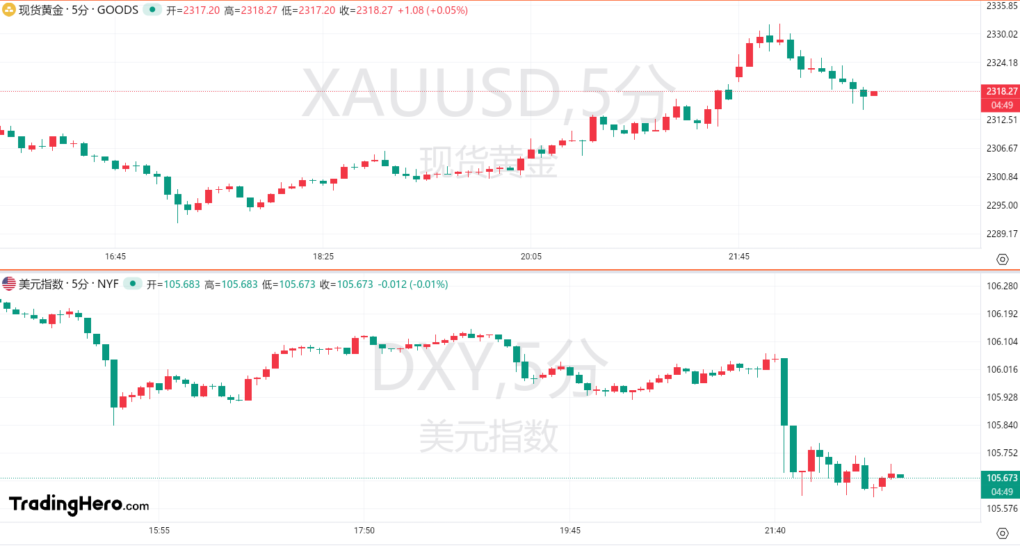 数据公布后,黄金一度重回2330美元关口上方,但很快便再度回落;美元指数短线一度下跌40点,并跌破106关口。