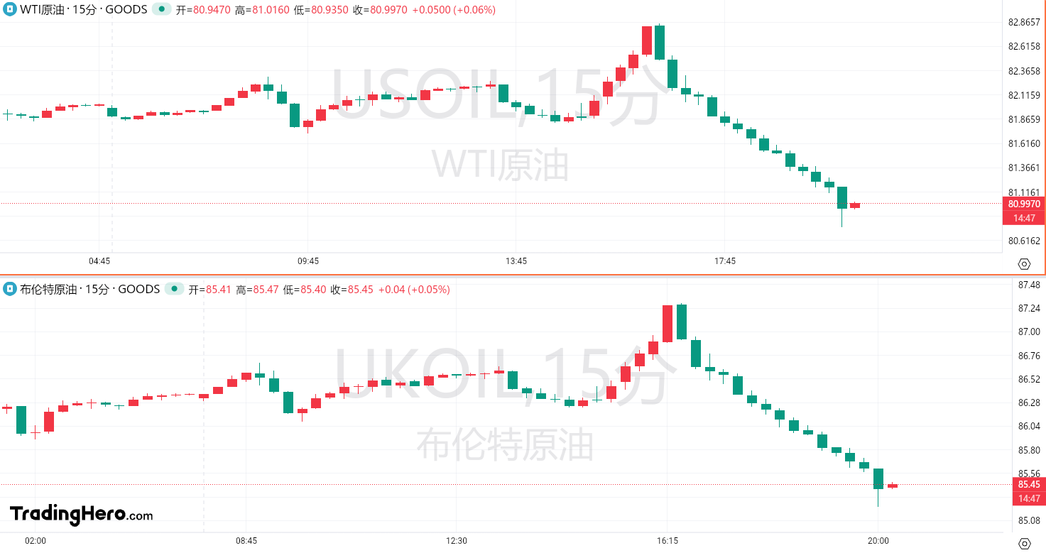 欧洲强劲的经济数据曾短暂提振了油价,但在周二美盘前,两油均跌超1%,WTI原油在涨至82.84美元后掉头直下,并自2月初以来首次跌破50日均线;布伦特原油也较87.28美元的日内高点大幅回落。