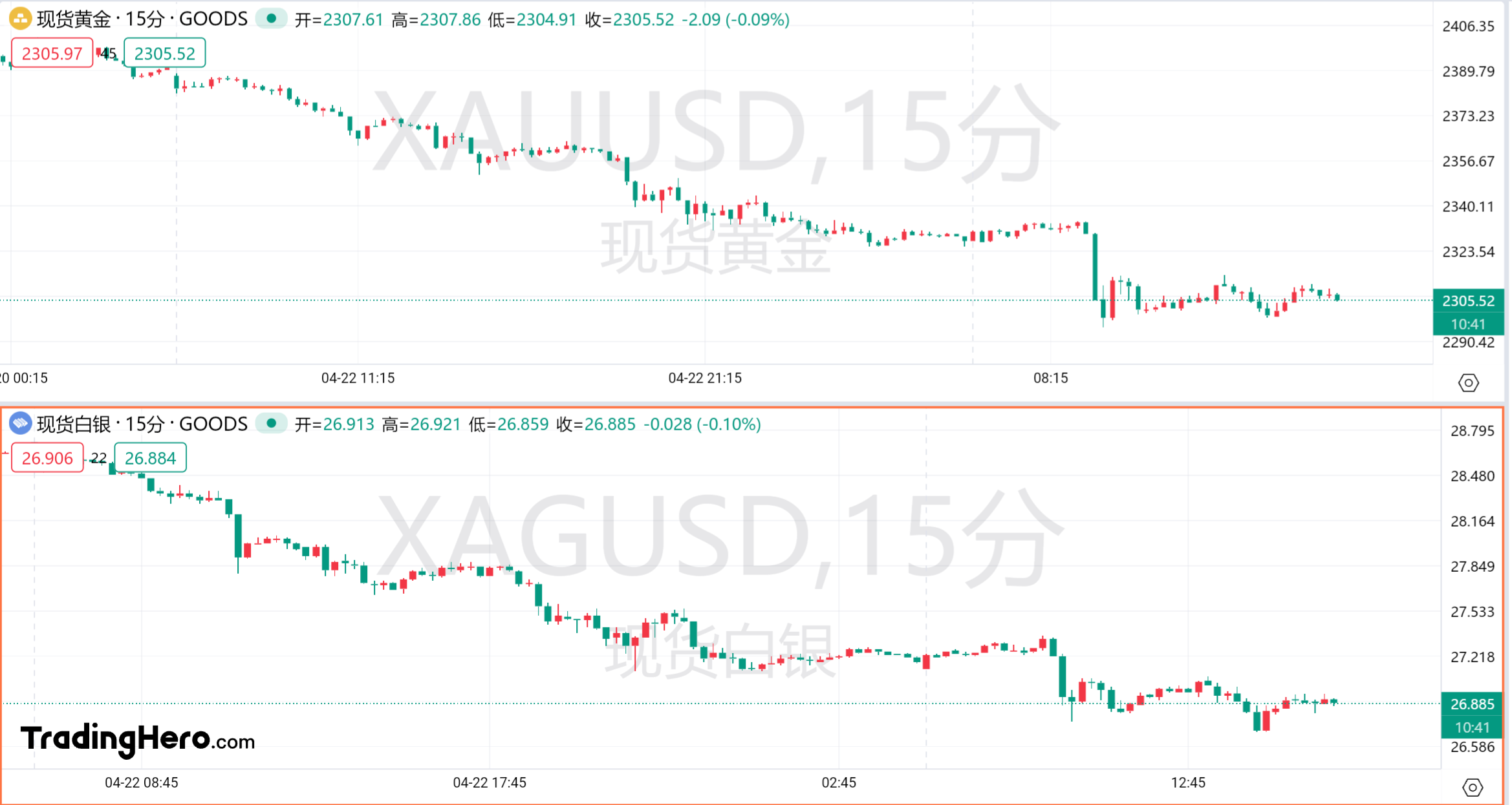4月23日,现货黄金延续跌势,亚盘期间一度跌破2300美元/盎司整数关口,最低触及2295美元。截至发稿,现货黄金暂时重回2300美元上方,但本周仍已跌去超80美元,引发市场对黄金涨势是否已经熄火、更大的回调是否已在路上的热烈讨论。现货白银则已经跌破27美元整数关口。
