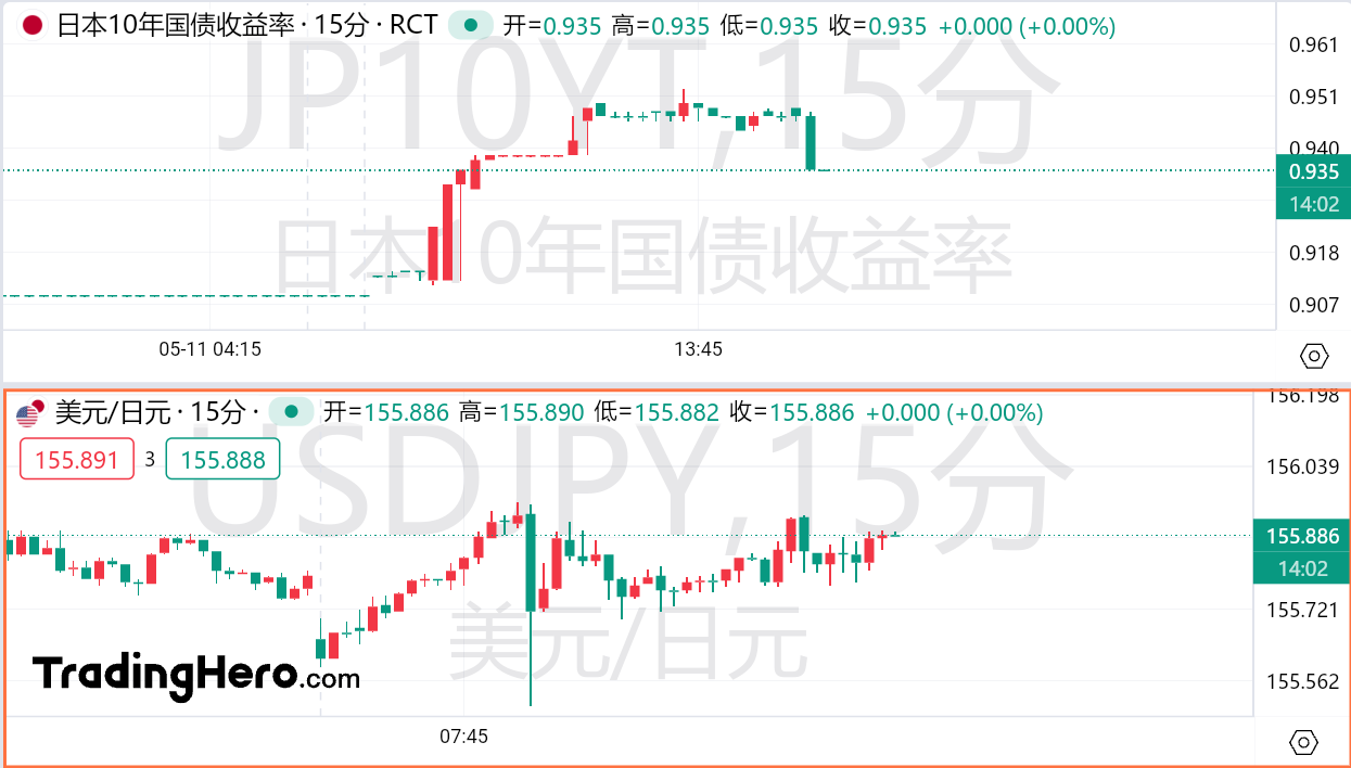 在日本央行宣布这一消息后,基准10年期日本国债收益率立即上升,日本基准10年期国债收益率上涨4个基点至0.94%,接近去年11月创下的十年高点0.97%。30年期日本国债收益率在午后交易中达到2.03%,创下2011年以来的最高水平。而日元兑美元则一度缩减了早前的跌幅,目前稳定在155.9附近。