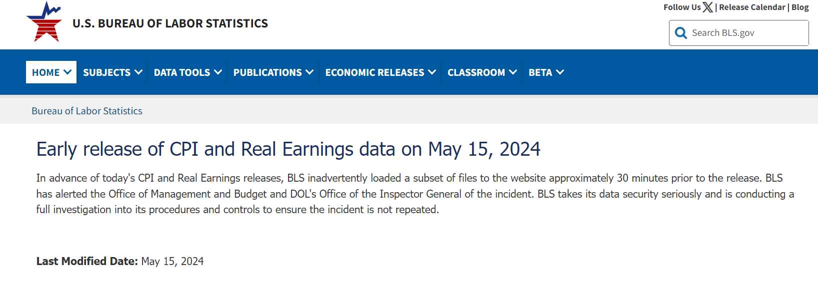 美国劳工统计局表示,在原定公布时间的30分钟前,它无意中公布了CPI数据。