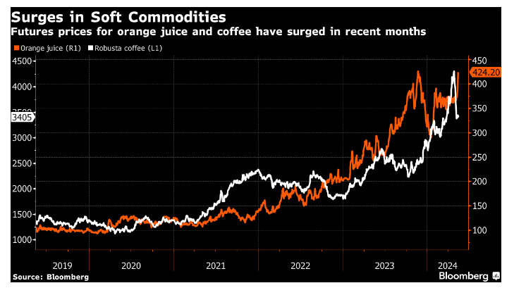 不稳定的天气模式也助长了其他软商品价格的飙升。橙汁期货价格本周跃升至创纪录高位,原因是市场预期全球最大的橙汁出口国巴西将迎来36年来最差的收成。与此同时,越南的干旱将罗布斯塔咖啡期货价格推高至40多年来的最高水平。