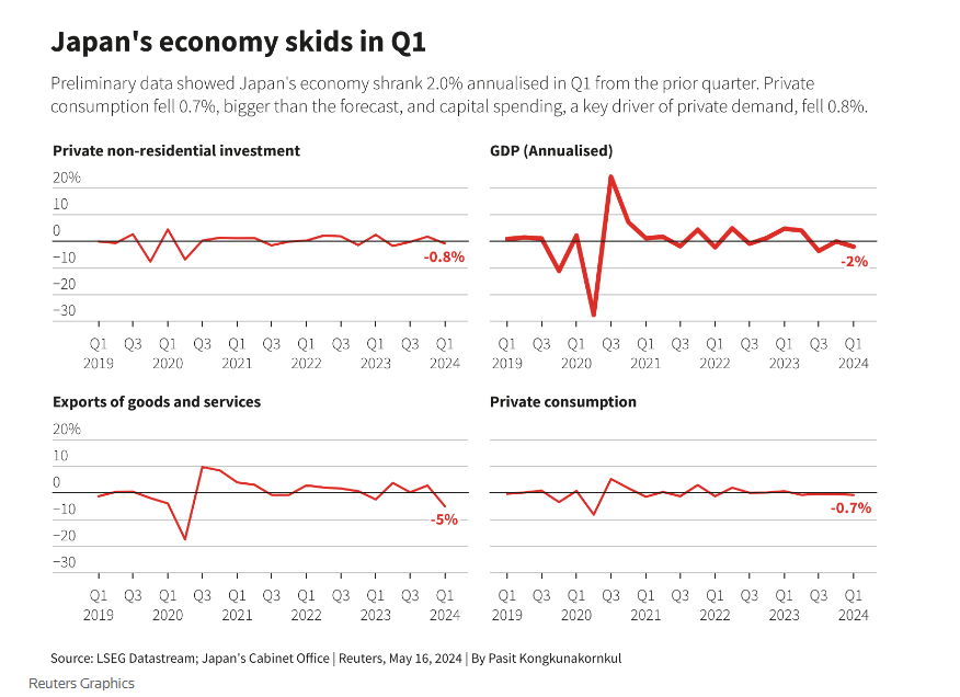 由于日元疲软继续打击消费者,日本第一季度经济下滑速度快于预期,这给日本央行货币政策正常化的进程带来了新的挑战。