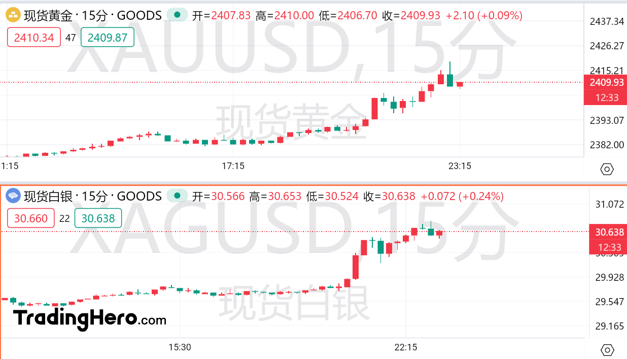 周五美盘前,白银价格在大单涌入后急涨,现货白银站上30美元关口,日内涨幅一度达到4%,不断刷新2013年2月以来新高。现货黄金突破2410美元/盎司,为4月19日以来首次,日内上涨逾1%。