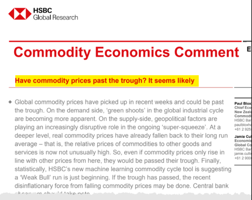 而当汇丰的Paul Bloxham和Jamie Culling上个月向客户提问称:“大宗商品价格已经触底了吗?”他们的回答非常简单:“看起来很有可能。”