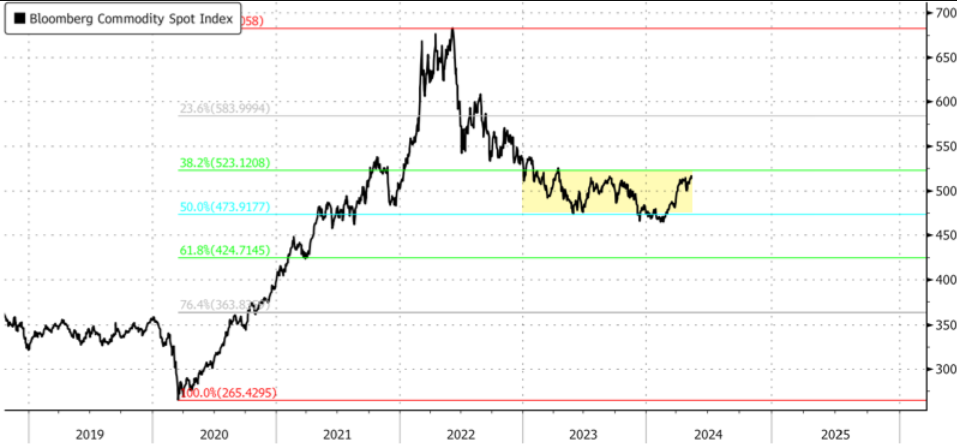 从更长的时间范围来看,从2020年初美国政府因新冠疫情而强制实施封锁期间的低点开始至2022年中涨至最高点,彭博大宗商品现货指数已经回吐了全部涨幅的50%。