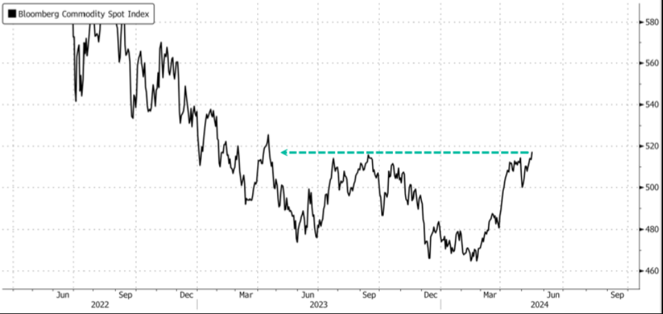 如今,彭博大宗商品现货指数正在走高,而与此同时,该指数最大的组成部分之一布伦特原油近几个月来也因需求增加、供应紧张以及中东地区持续不断的冲突而走高。此外,铜价也创下两年多来新高,可可和咖啡价格最近也大幅上涨。