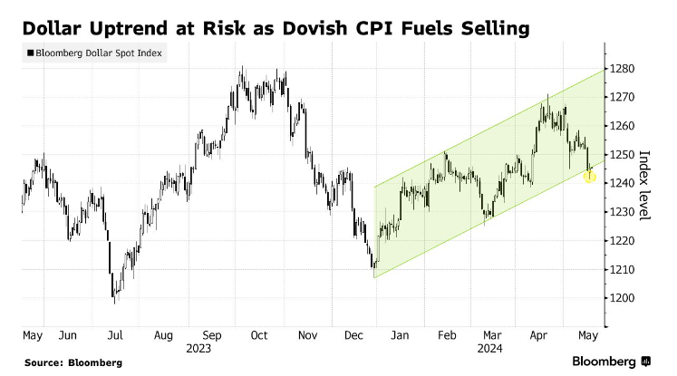随着投资者争论美联储何时可能降息,彭博美元现货指数有跌破2024年上升趋势的危险。尽管一些美联储官员采取了某种反击措施,暗示可能在更长时间内维持高借贷成本,但市场仍预计美联储将在9月降息。
