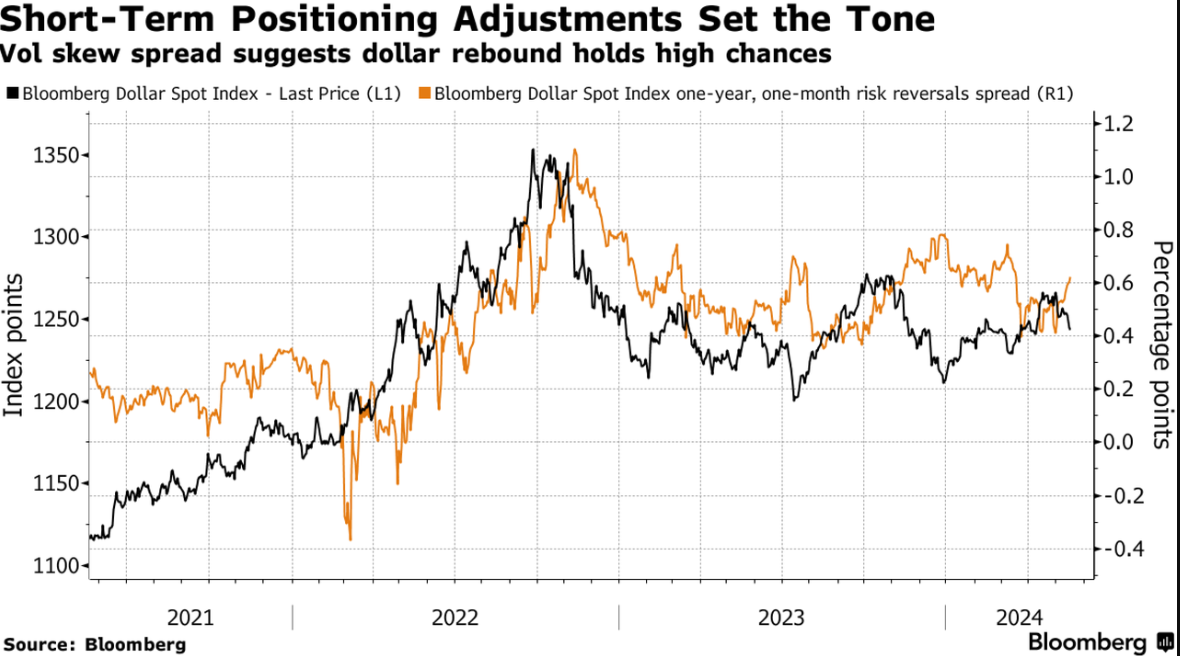 直到一周前,投资者还在现货市场做多美元,处于曲线的前端;彭博美元现货指数的交易价格目前处于一个多月来的最低点,但仍高于4月份的低点。