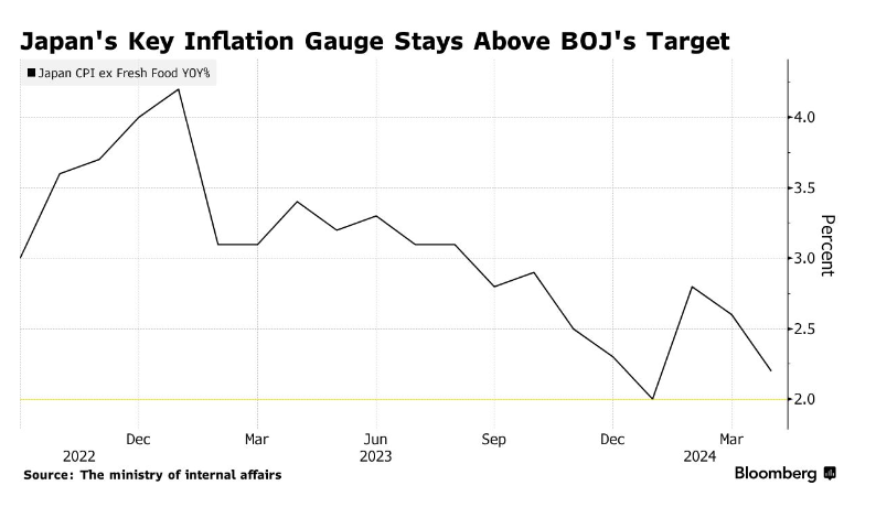 日本总务省周五公布的数据显示,4月份不包括新鲜食品的消费者价格(CPI)同比上涨2.2%,为连续第二个月降温,与分析师的预期相符。该指数连续25个月保持在或高于日本央行2%的目标水平,但政策制定者仍渴望看到日本的价格上涨趋势是由可持续的国内需求推动的。
