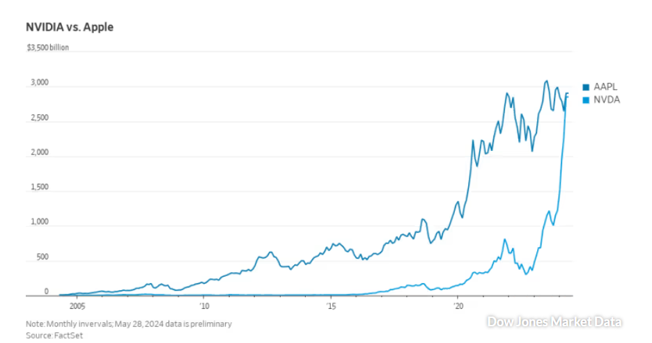 英伟达股票大涨的同时,苹果股票今年则一直处于低迷状态。现在,两者的市值差距(658亿美元)是2009年以来最小的,英伟达有望成为有史以来第三家在交易日结束时市值达到3万亿美元的美国公司。