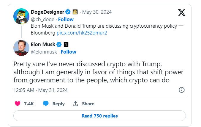 此前彭博社报道称,马斯克和特朗普正在讨论与加密货币相关的政策,后者在竞选活动中越来越多地强调比特币和其他数字资产。马斯克则被认为是柴犬币和狗狗币的粉丝。