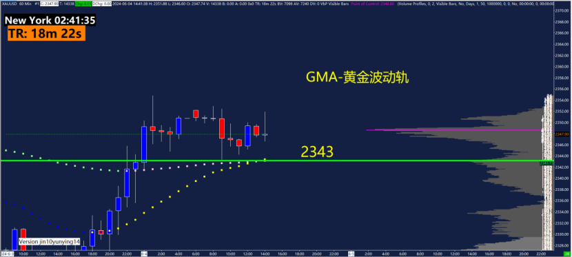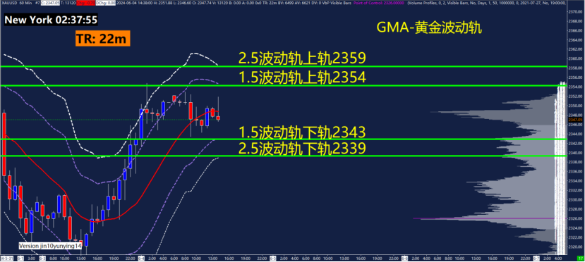 60分钟GMA-黄金波动轨指标关键点位2339、2343、2354、2359,可以关注这些位置附近的波动轨变化。黄金波动轨是依据波动率计算测算出来的,在震荡行情用法为触轨即可能反转!重点关注1.5倍波动轨和2.5倍波动轨位置。