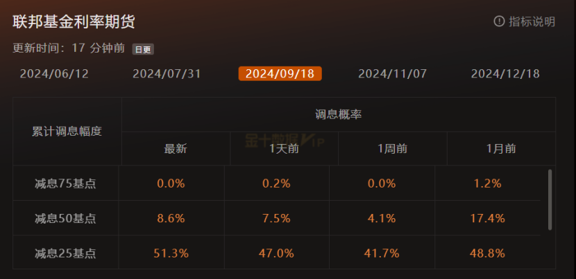 FEDWATCH显示,美联储9月降息25个基点的预期为51.3%,年底利率可能降至5.25%。