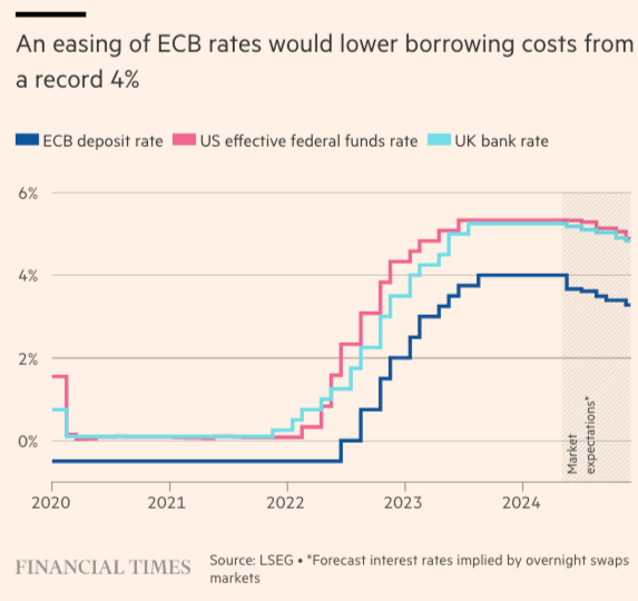 欧洲央行去年将基准存款利率提高至创纪录的4%,抑制了经济活动,以应对一代人以来最严重的物价飙升。