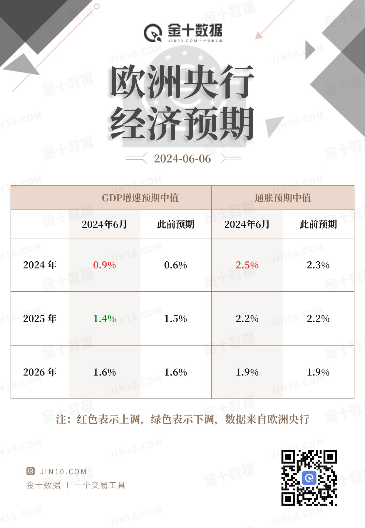 欧洲央行工作人员发布的有关经济增长和通胀的最新季度预测也备受关注。与3月份的预测相比,欧洲央行工作人员对2024年GDP增长预期和通胀预期都有所上调,预计2024年通胀率为2.5%,2025年为2.2%,2026年为1.9%。(3月预期分别为2.3%、2.0%、1.9%);预计2024年GDP增长率为0.9%,2025年为1.4%,2026年为1.6%。(3月预期分别为0.6%、1.5%、1.6%)。