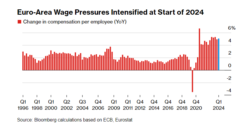 他们的一大关注点是薪资数据。周五,欧洲央行青睐的衡量薪资的关键指标显示,2024年初工资增长加速,第一季度员工人均薪酬较上年同期增长5.1%,高于前三个月修正后的4.9%。