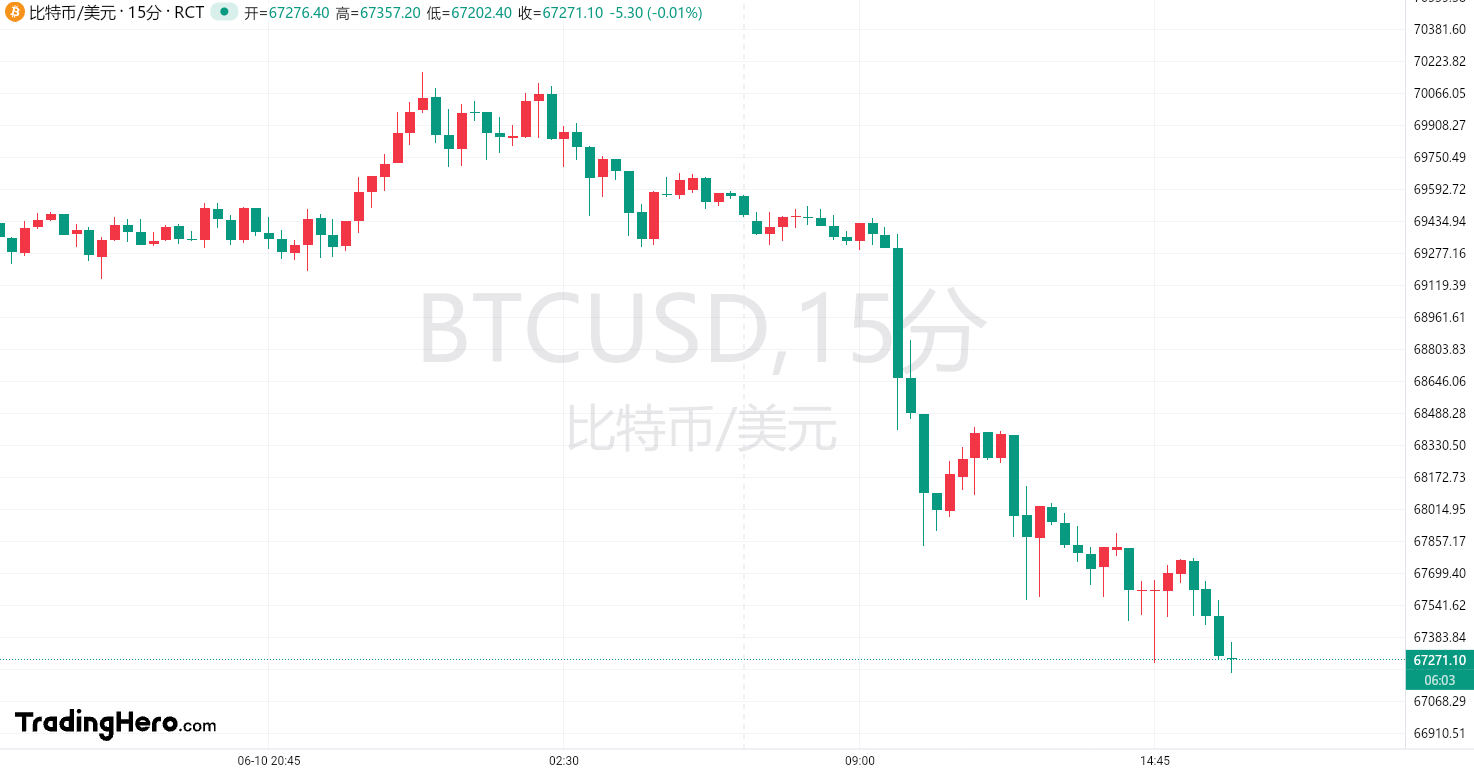 比特币周二大跌3%,至一周低点,在67500美元附近徘徊。