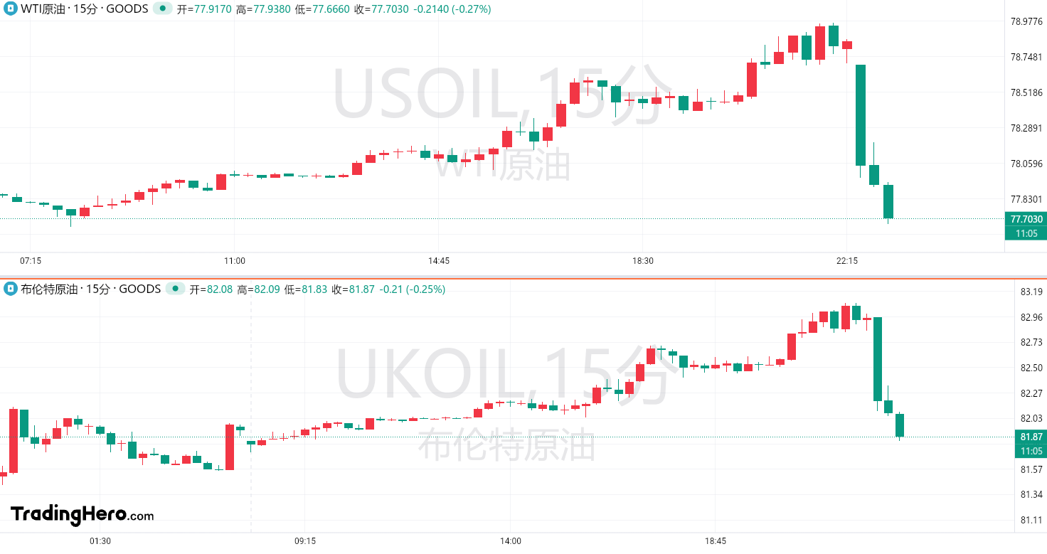 数据公布后,两油直接转跌,WTI原油扭头直下,并跌破78美元;布伦特原油一度跌破82美元。