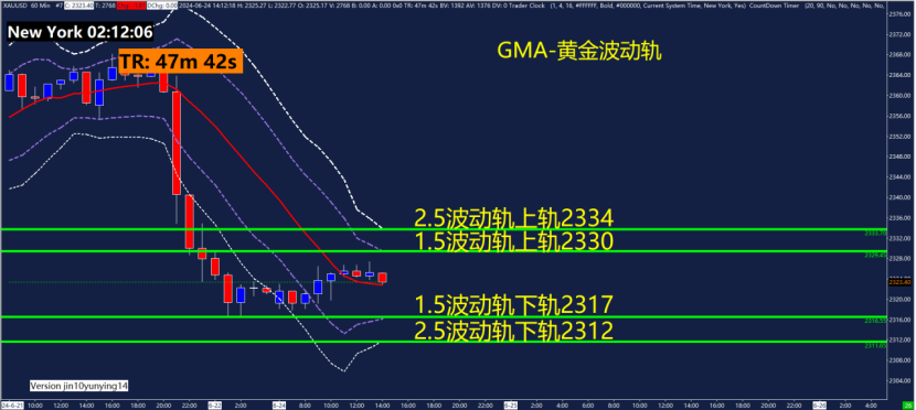60分钟GMA-黄金波动轨指标关键点位2312、2317、2330、2334,可以关注这些位置附近的波动轨变化。黄金波动轨是依据波动率计算测算出来的,在震荡行情用法为触轨即可能反转!重点关注1.5倍波动轨和2.5倍波动轨位置。