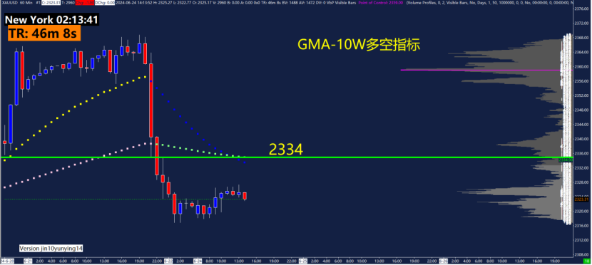 60分钟GMA-10W多空指标关键点位2334,可以关注这些位置附近的10W多空指标的变化。10W多空指标是趋势追踪指标,当快线慢线变色之后形成交叉,那么趋势得以确认。快线慢线变色的位置需要特别留意,是否存在布局机会。